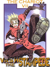 THE CHARIOT Headlong rush to a destination. Speed. Out of control. Escape. Travel. Attention to details. Overcoming adversity. Conflict. Uncontrollably emotional. Impulsiveness. Authority. Asserting control. VASH THE STAMPEDE Vash is called 'the Stampede' because disaster and chaos follow him, as uncontrollable as a stampede. He is a paradox: a pacifist gunfighter, by turns mature and goofy, surrounded by violence while chanting "LOVE AND PEACE!". He empathizes with others and when he loves, loves with a passion. He drifts from town to town , searching for love (or so he claims) while trying to get a handle on his past. Due to his sense of justice he tends to jump into events headfirst and is often dragged further by outside people or events. He is associated with massive destruction and devastation, but doesn't instigate it. Vash is often merely a weapon while someone else -- his brother -- pulls the trigger. He is internally conflicted, trying to hold true to the ideals of a past love while being forced into situations that cause him to compromise those ideals, and when he finally does it almost breaks him. | |