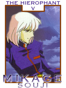 THE HIEROPHANT Ceremony. Liturgy. Education. Discipline. Abeyance. Commiseration. Mercy. Absolution. Exoneration. Illumination. Fearfulness. Servitude. Uniformity. Institutionalized setting. MIKAGE SOUJI Mikage seems to be a genius student at Ohtori Academy, powerful and respected by students and faculty alike as the head of the Mikage Seminar. In reality, he exists out of time and space. He was originally the Professor Nemuro who created the projector that generates the Dueling Arena, but now is trapped in an endless loop of time in Ohtori Academy. He uses ceremonious and ritualistic methods to exploit emotions and passions of the Black Rose duelists, manipulating them into attempting to defeat Tenjou Utena in order to grasp the secrets of eternity and recreate his lost past, while holding his own emotions in strict check. It is only with great provocation that he sheds one tear, and he marvels at it. In the end, though, Mikage is unable to survive seeing beyond his illusions -- namely that he created his memories in part to try to retrieve a lost love and part to assuage the guilt of burning down a building and killing a hundred students -- and the manipulator is manipulated out of time and existence by Ohtori Akio. | |