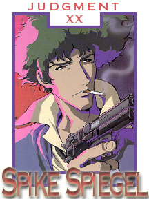 JUDGMENT Hard choices. Atonement. Transformation and rebirth. Conviction. Improvement. Absolution. Becoming accountable. SPIKE SPIEGEL Spike is a man who knows about hard choices, change, and determination, once having been part of a criminal organization. He eventually thought better of it and left, although he is still haunted by his past. Spike is now a bounty hunter, aiding the law in apprehending criminals and bringing them to justice, although he has been known to make his own decisions about the guilt or innocence of a target. | |