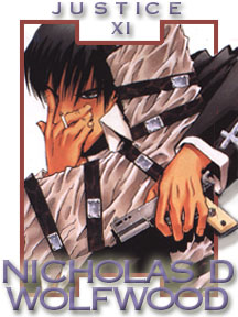JUSTICE Righteousness. Justice. Balance. Equanimity. Accord. Integrity. Responsibility; doing what has to be done. Examining issues and choosing. Accepting results. NICHOLAS D. WOLFWOOD A priest and gunslinger, Wolfwood is a conflicted man. He sends money earned with violence to the orphanage where he was raised and nurtures a passionate desire that no child suffers ever again, and yet when it comes down to it, he considers, makes a decision, and kills a child to ensure the safety of others. Wolfwood is a man who can choose the unthinkable for the greater good and who can live with the results. If something has to be done, he is the one who can do it. He strikes a balance between good and evil and at the end makes the right choice and suffers the consequences he knew would come. | |