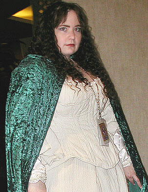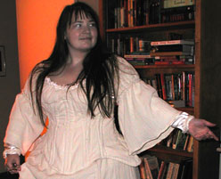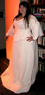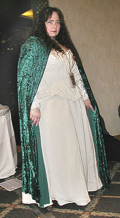 status: Finished -- links to photos below worn: By me, at A-Kon 2001 how it was made: I was reading "Animerica" and discovered this dress in their section on the new Vampire Hunter D movie, and then found the pictures you see on the Web. I've sewn corsets before, and I designed this dress to have three parts -- shirt, skirt, corset-bodice -- all covered with gauze. The cloak is a cheapish velvet, with a padded wire framework for the shoulders. The corset worked out fairly well, except for an annoying tendency to poke straight out at the hips 'cause I made the bottom part a bit too big. I ran out of the gauzy fabric so I didn't have enough to do an entire shirt. So I did the sleeves and the bits you see over the top of the corset, sewed it to a shirt made of another fabric, and sewed the whole shebang to the corset so it wouldn't pull out. The gauzy fabric -- well, that's another story entirely. I couldn't find any in a neutral color, so I ended up buying a bolt of acid-yellow and running it through both bleach and color-removal stuff several times, then since it was still a (paler) yellow, I dyed it purple to counteract the yellow, then did the color-removal one last time, and it came out a perfect beige. I only wish I had some better pictures. The pictures you're seeing are the ones I'm working from. I also wish I had a picture of another dress she wears -- you can see it for an instant in the Vampire Hunter D 2000 trailer online, and it seems to have a train and a bustle. I've done bustle dresses before -- I can do it, they look good on me. If only I had a clue as to what the rest of it looked like ... oh well, there's always A-Kon 2002, hm? |